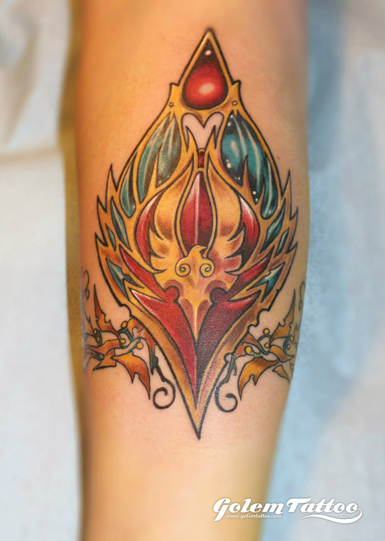 Regarderons attentivement l’emblème des Elfes de sang gravé à même la peau. Nelthariane, sur Hyjal, nous présente l’emblème des Elfes sang qu’elle porte désormais fièrement. Vous pouvez retrouver ce symbole, le phénix, sur toutes les bannières et armoiries de la race dans le jeu. Ce tatouage a été réalisé par Golem Tattoo. Pour l’anecdote, le tatoueur est un ancien joueur !